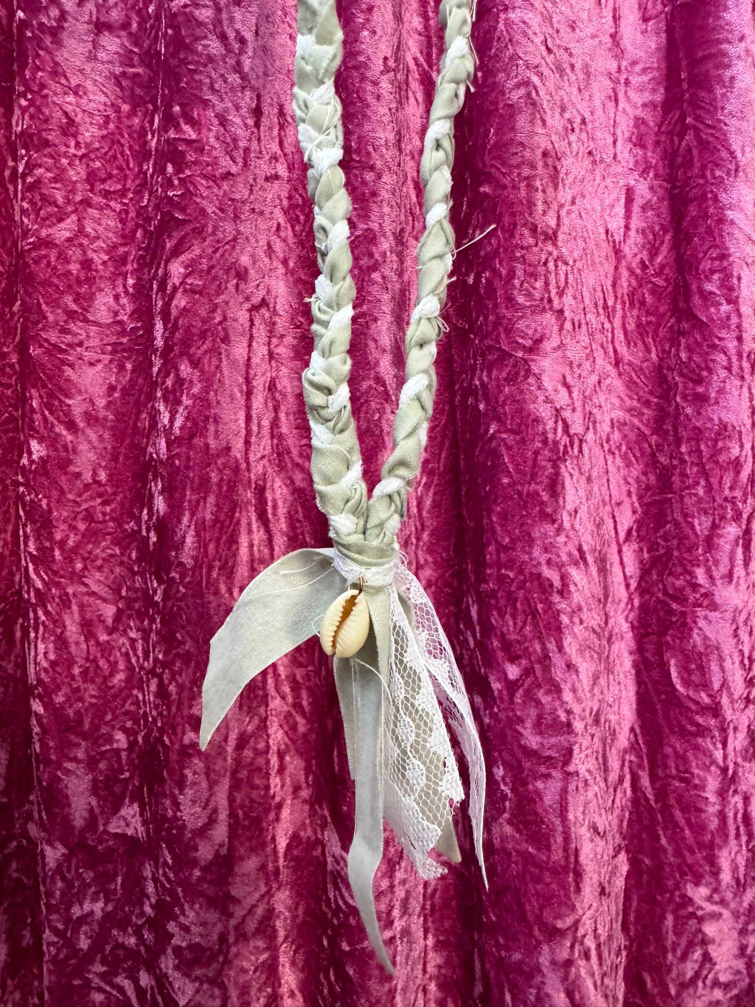 Vintage gevlochten ketting met kant en schelpen kraaltje.