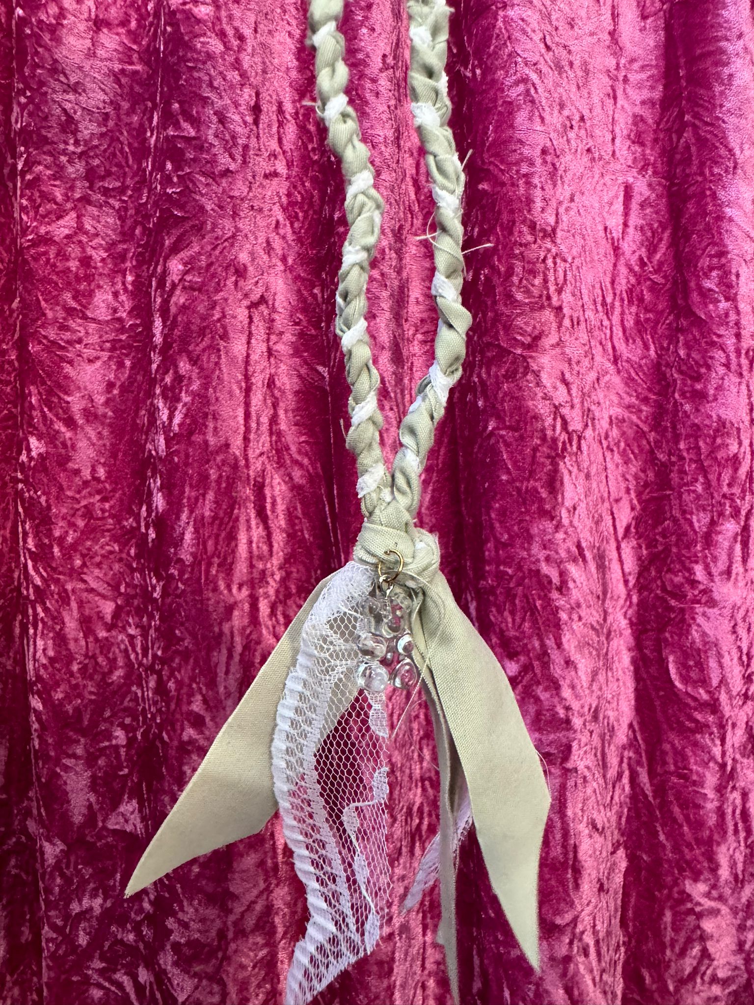 Vintage stoffen gevlochten ketting met kant en een beren hanger.