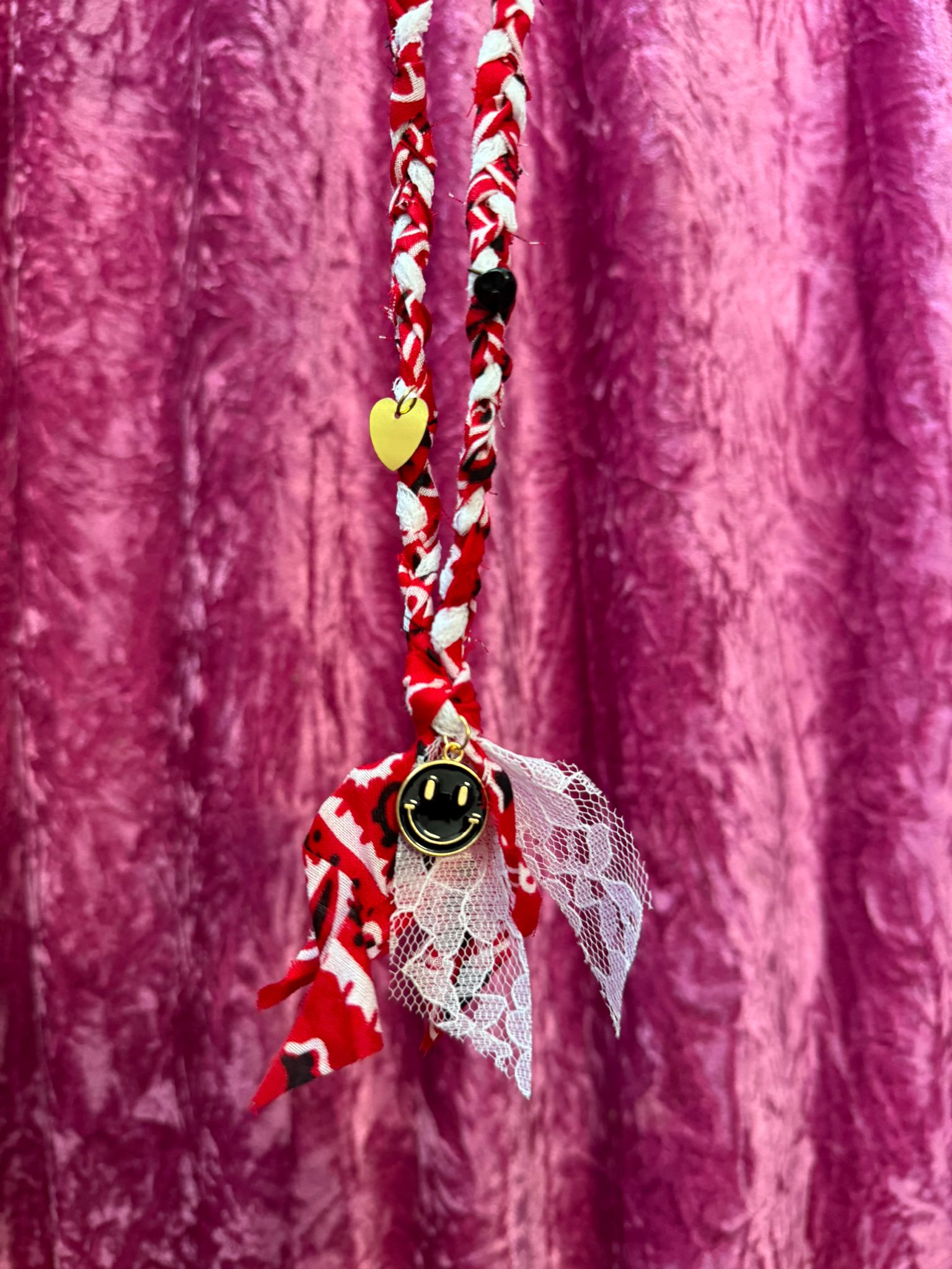 Vintage gevlochten bandana ketting met smiley hanger.