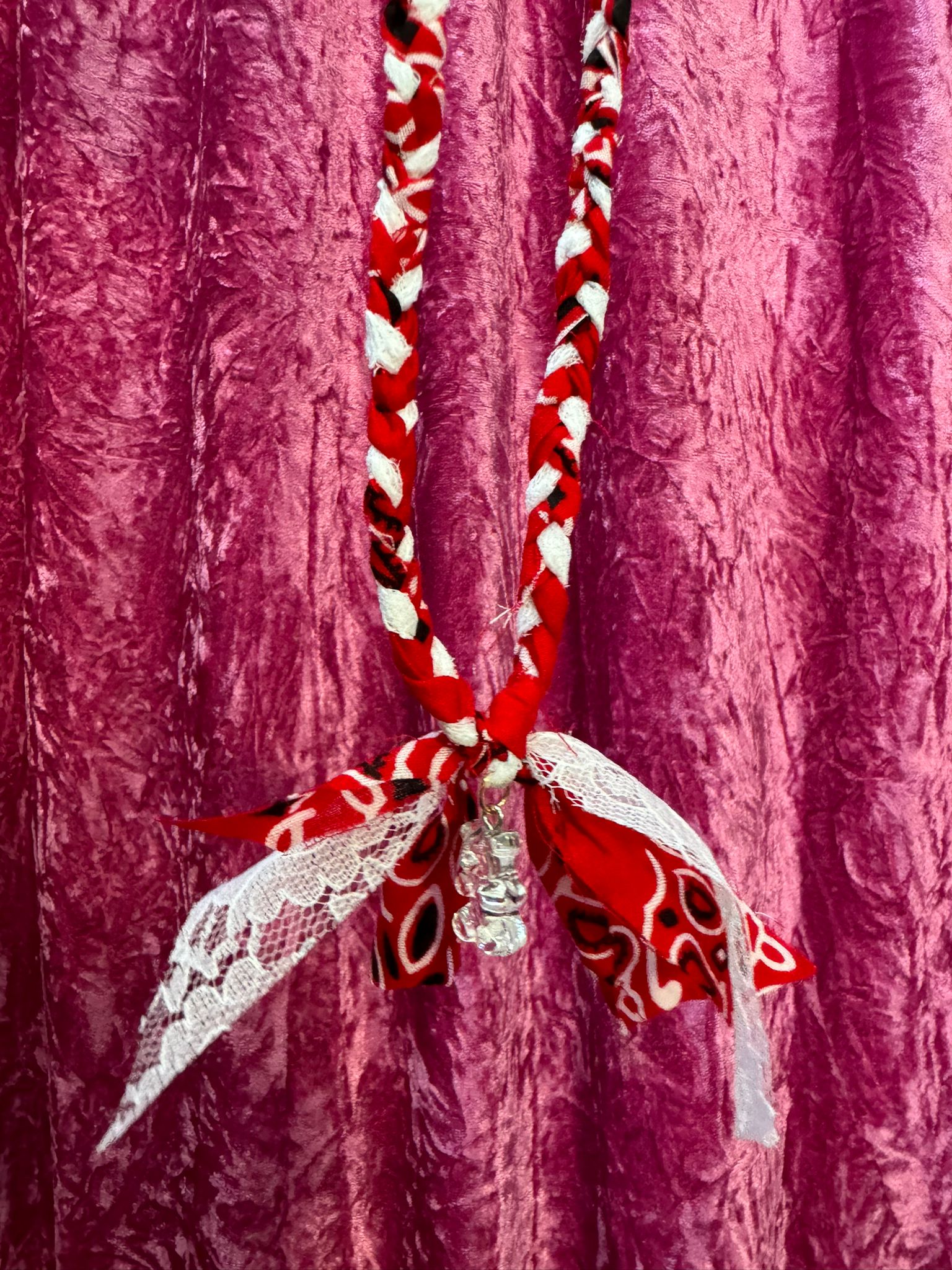 Vintage gevlochten bandana ketting met een beren hangertje.